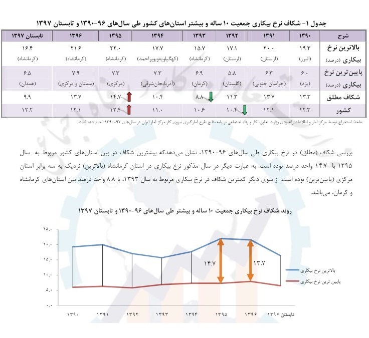 بالاترین نرخ بیکاری در سال 97 متعلق به کرمانشاه با نرخ 16.4 درصد و پایین ترین نرخ بیکاری در سال 97 متعلق به همدان با 6.5 درصد است که بررسی شکاف مطلق در نرخ بیکاری طی سال های 90 تا 97 نشان می دهد که بیشترین شکاف در بین استان های کشور مربوط به سال 95 با 14.7 واحد درصد بوده است.