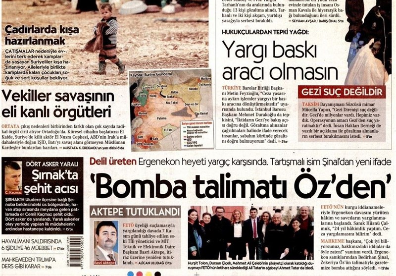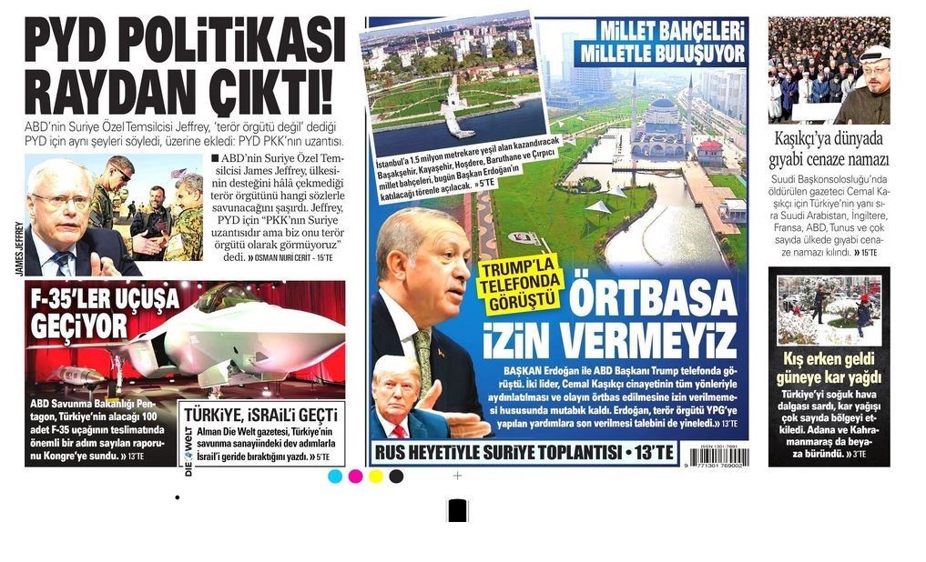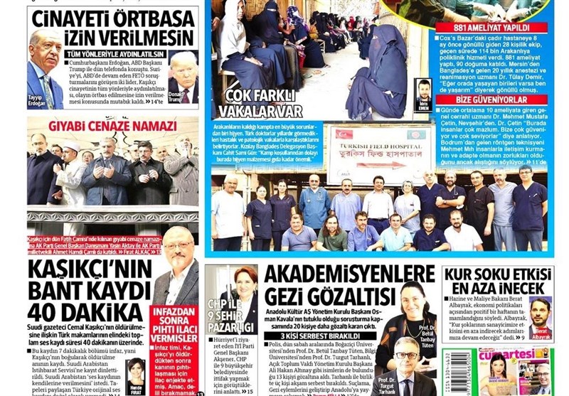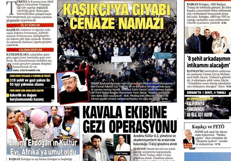 به گزارش گروه بینالملل خبرگزاری تسنیم، بسیاری از روزنامههای ترکیه، امروز در عکس و تیتر صفحه نخست، گفتوگوی تلفنی اردوغان و ترامپ در مورد پرونده قتل جمال خاشقجی را برجسته کردهاند. همچنین این روزنامهها موضوعات دیگری مانند دستگیری افراد گولن را مورد توجه قرار دادهاند.