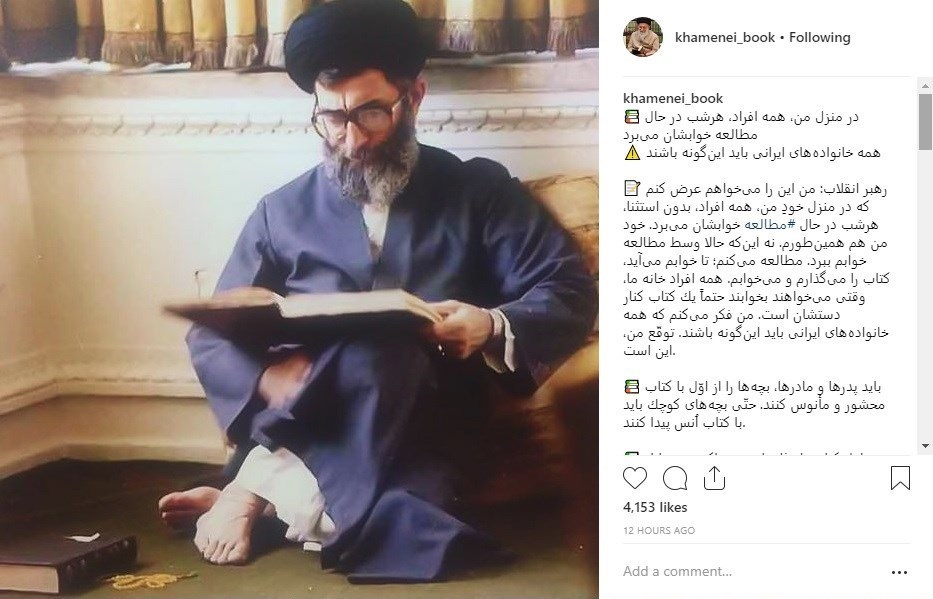 رهبر انقلاب: من این را مىخواهم عرض کنم که در منزل خودِ من، همه افراد، بدون استثنا، هرشب در حال مطالعه خوابشان مىبرد. خود من هم همینطورم. نه اینکه حالا وسط مطالعه خوابم ببرد. مطالعه مىکنم؛ تا خوابم مىآید، کتاب را مىگذارم و مىخوابم. همه افراد خانه ما، وقتى مىخواهند بخوابند حتماً یک کتاب کنار دستشان است. من فکر مىکنم که همه خانوادههاى ایرانى باید اینگونه باشند. توقّع من، این است. باید پدرها و مادرها، بچهها را از اوّل با کتاب محشور و مأنوس کنند. حتّى بچههاى کوچک باید با کتاب اُنس پیدا کنند. اوّل کتاب را مثل نان و خوراکى و وسایل معیشتى لازم بخرند؛ بعد که این تأمین شد به زواید بپردازند. 1374/02/26