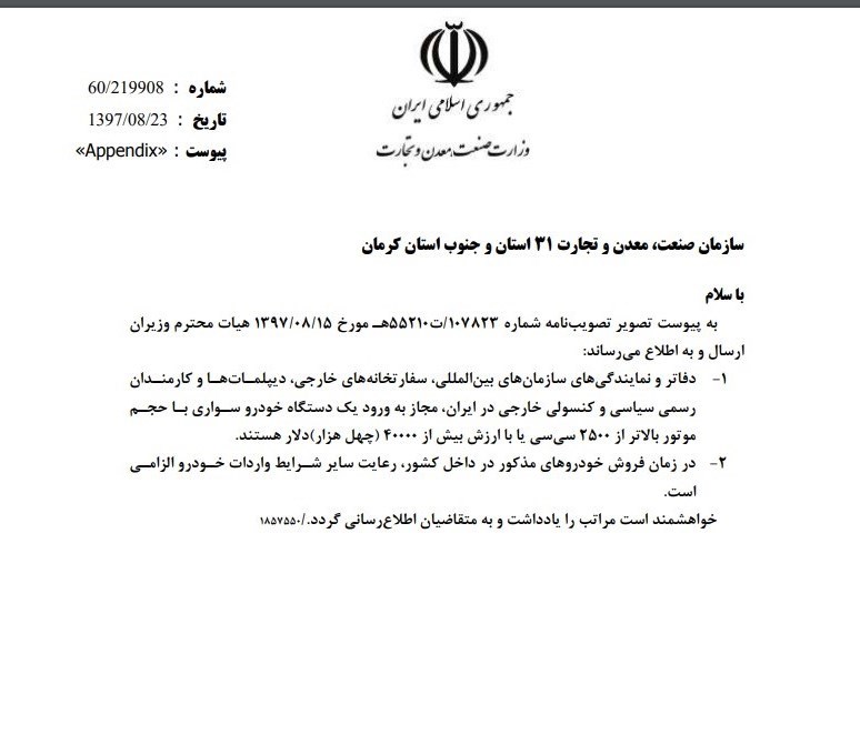 به گزارش خبرنگار اقتصادی خبرگزاری تسنیم، وزارت صنعت، معدن و تجارت با ارسال نامه ای به سازمان های خود در استانها، براساس مصوبه هیئت وزیران شرایط جدید واردات خودروهای سازمان های بین المللی، سفارتخانه های خارجی، دیپلماتها و کارمندان رسمی سیاسی و کنسولی خارجی در ایران را اعلام کرد: در این نامه آمده است این افراد مجاز به ورود یک خودرو سواری با حجم موتور بالاتر از 2500 سی سی یا با ارزش بیش از 40000( چهل هزار) دلار هستند.