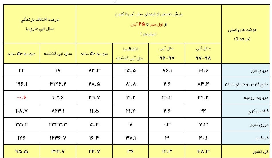 این مقدار بارندگی نسبت به میانگین دورههای مشابه درازمدت (24.7 میلیمتر) 95.5 درصد افزایش و نسبت به دوره مشابه سال آبی گذشته (12.3 میلیمتر) 292.7 درصد افزایش نشان میدهد.