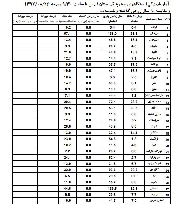 میزان بارندگی در 12 نقطه فارس بالاتر از میانگین استانی و در 16 نقطه پایینتر از میانگین استان بوده است.