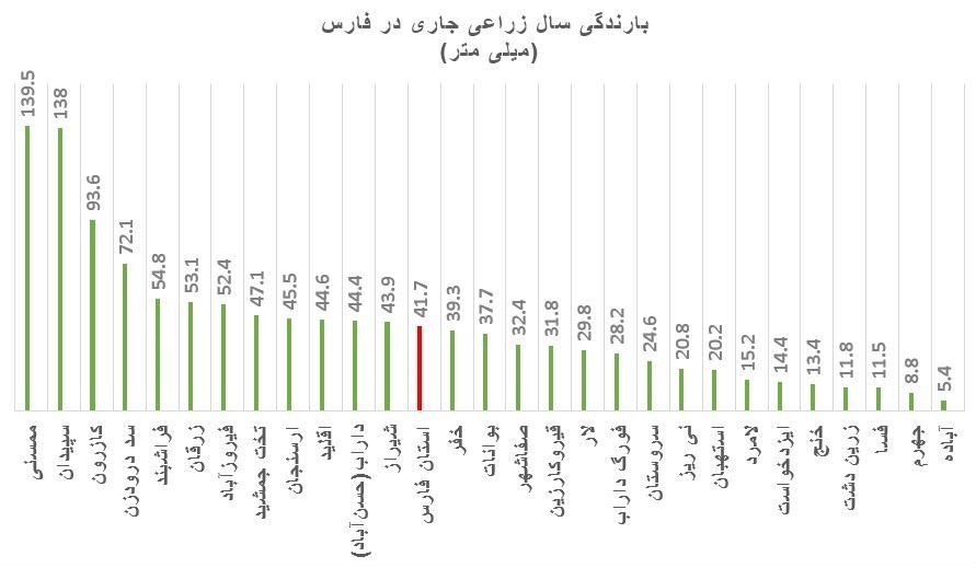 در سال زراعی جاری ممسنی (139.5 میلیمتر)، سپیدان (138 میلیمتر) و کازرون (93.6 میلیمتر) پر بارشترین شهرهای فارس و فسا (11.5 میلیمتر)، جهرم (8.8 میلیمتر) و آباده (5.4 میلیمتر) کمبارشترین شهرهای این استان بودهاند.