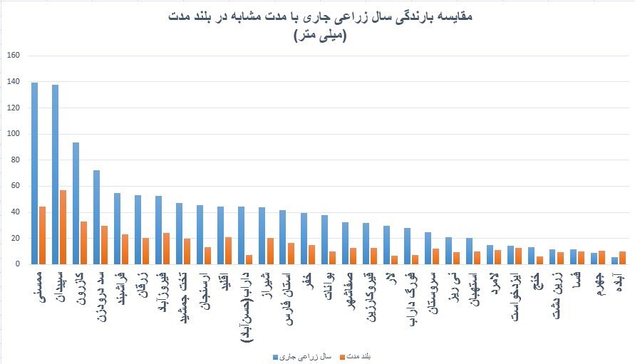 مقایسه بارندگی سال زراعی جاری با مدت مشابه در بلند مدت بیانگر این است که بارندگی در همه شهرهای استان فارس به جز «جهرم» و «آباده» روند افزایشی داشته است.