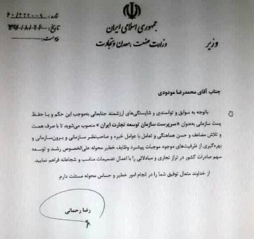 در حکم رضا رحمانی برای مودودی آمده است: با توجه به سوابق و توانمندی و شایستگی های ارزشمند جنابعالی به موجب این حکم و با حفظ پست سازمانی به عنوان سرپرست سازمان توسعه تجارت ایران منصوب می شوید تا با صرف همت و تلاش مضاعف و حسن هماهنگی و تعامل با عوامل خبره و صاحب نظر سازمانی و برون سازمانی و بهره گیری از ظرفیت های موجود موجبات پیشبرد وظایف خطیر محوله علی الخصوص رشد و توسعه سهم صادرات کشور در تراز تجاری و مبادلاتی را با اعمال تصمیمات مناسب و شجاعانه فراهم نمایید.
