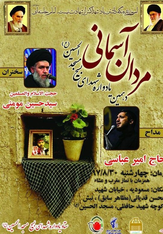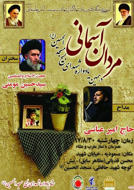 این مراسم با سخنرانی حجتالاسلام سیدحسین مؤمنی و مداحی امیر عباسی در مسجد الحسین(ع) واقع در مسعودیه، خیابان شهید قدیانی(مظاهر سابق)، نبش کوچه حافظی برگزار خواهد شد.