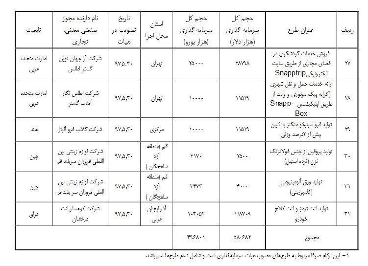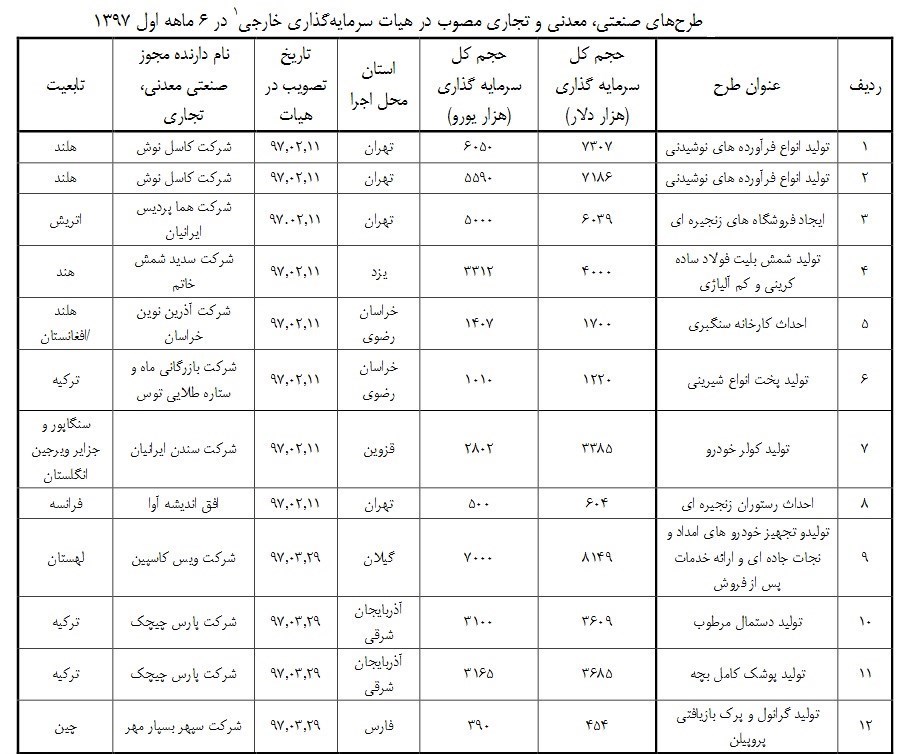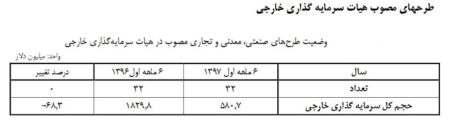 جزئیات طرح های صنعتی و معدنی تجاری در هیأت سرمایه گذاری خارجی در 6 ماهه امسال به شرح زیر است: