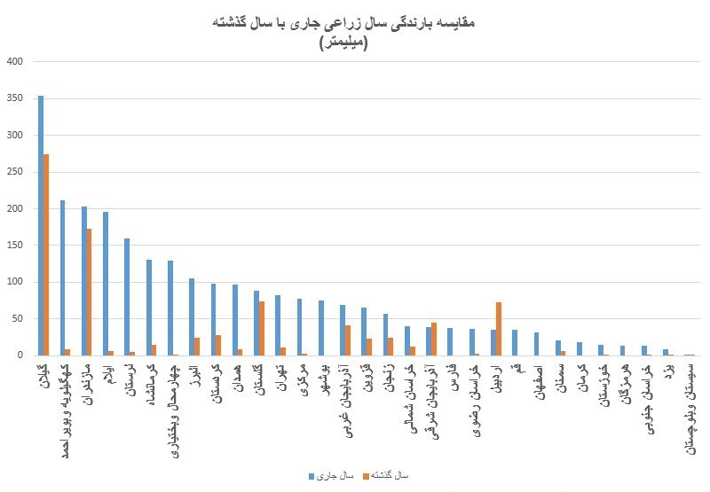 این مقدار بارندگی نسبت به میانگین دورههای مشابه درازمدت ( 26.3 میلیمتر) 84.8 درصد افزایش و نسبت به دوره مشابه سال آبی گذشته ( 12.3 میلیمتر) 295.1 درصد افزایش نشان میدهد.