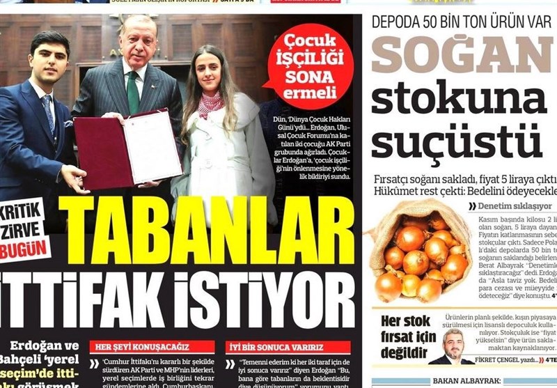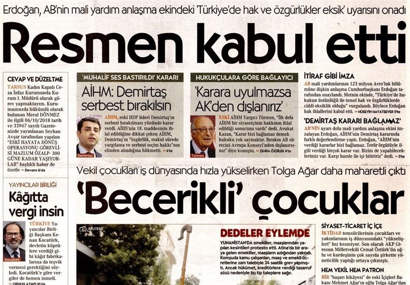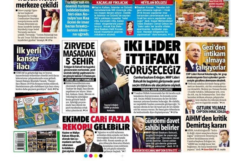 به گزارش گروه بینالملل خبرگزاری تسنیم، بسیاری از روزنامههای ترکیه، امروز در عکس و تیتر صفحه نخست، تصمیم اردوغان و باغچلی برای دیدار و بررسی ائتلاف را برجسته کردهاند. همچنین این روزنامهها موضوعات دیگری مانند حکم دادگاه حقوق بشر اروپا مبنی بر ضرورت آزادی فوری صلاحالدین دمیرتاش را مورد توجه قرار دادهاند.
