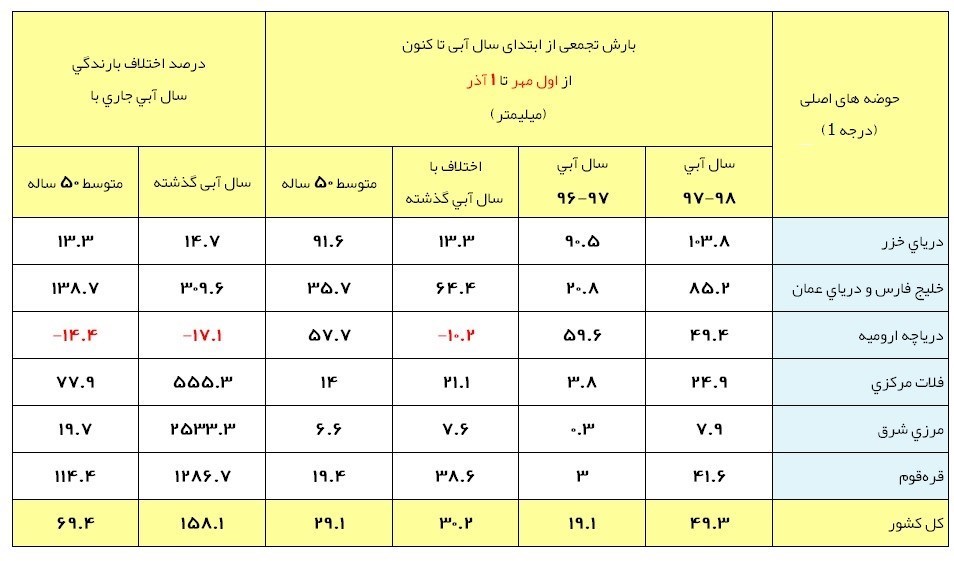 به گزارش خبرنگار اقتصادی خبرگزاری تسنیم، بر اساس آمار رسمی دفتر مطالعات پایه منابع آب شرکت مدیریت منابع آب ایران، ارتفاع کل ریزشهای جوی از اول مهر تا اول آذر سال آبی 98-97 (61 روز ابتدایی سال آبی جاری) بالغ بر 49.3 میلیمتر است.