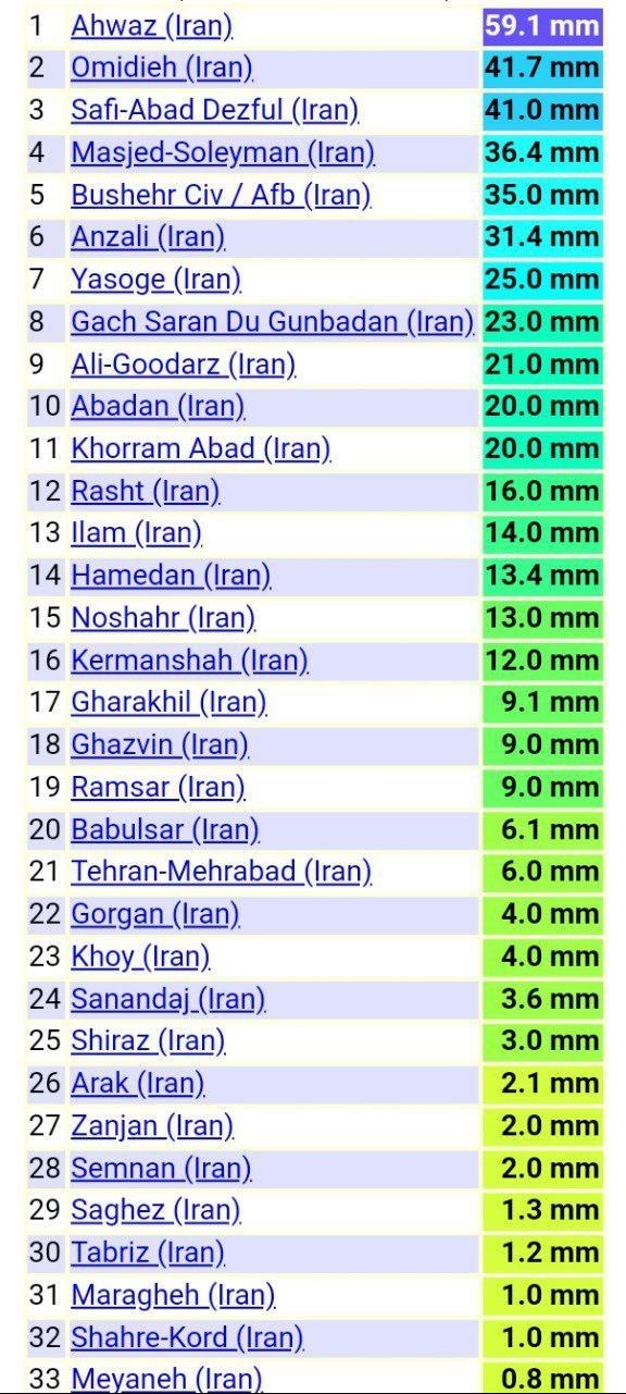 بر اساس جدول بارش‌های 24 ساعت گذشته، شهر اهواز در استان خوزستان با میانگین بارش 59 میلیمتر پربارش‌ترین نقطه کشور است و ...