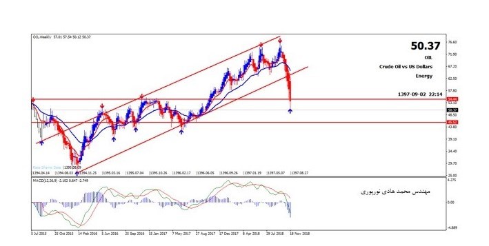 به گزارش خبرگزاری تسنیم، بررسی قیمت نفت نشان می دهد که کانال صعودی 2 ساله نفت پس از رسیدن به سقف قیمتی 76 دلاری شکسته شده و با توجه به اهداف قیمتی پیش روی آن احتمال کاهش قیمت تا کلاستر حمایتی 45 دلار و حتی 40 دلار نیز وجود دارد .در صورتی که نفت بتواند مقاومت 54دلاری را شکسته و بالای آن تثبیت شود می توان گفت روند نزولی پایان یافته است. ذکر این نکته ضروری می نماید با توجه به افت سنگین قیمت نفت و وجود واگرایی مثبت از نوع رگولار در تایم فریم های پایین تر، احتمال پولبک و رشد قیمت در کوتاه مدت تا کانال قیمتی 52 تا 54 دلاری وجود دارد.