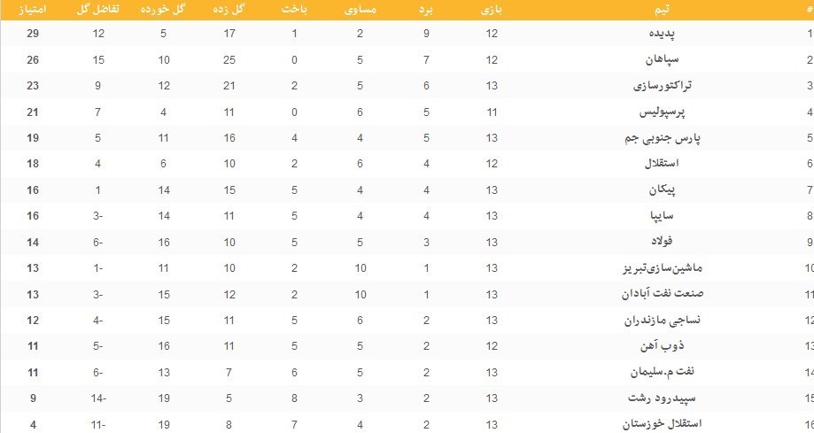 جدول ردهبندی لیگ برتر، در پایان هفته سیزدهم: