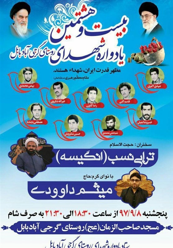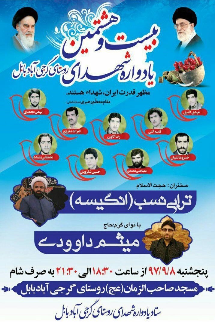 بنابر اعلام ستاد یادواره شهدای گرجی آباد بابل، بیست و هشتمین یادواره 9 شهید روستای گرجی آباد شهرستان بابل از ساعت 18:30 پنج شنبه هشتم آذر 97 در مسجد صاحب الزمان (عج) این روستا برگزار می شود.