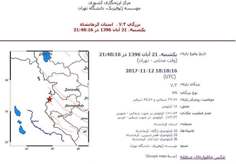 گزارش مرکز لرزهنگاری آمریکا از زلزله اخیر در کرمانشاه