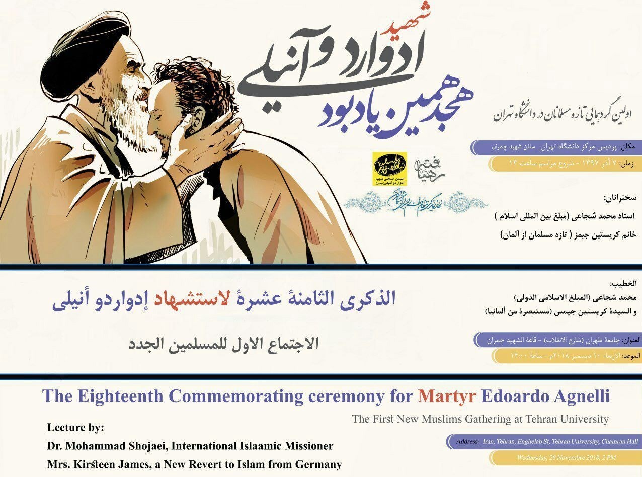 به گزارش خبرنگار فرهنگی باشگاه خبرنگاران پویا، اولین گردهمایی تازه مسلمانان در دانشگاه تهران و هجدهمین یادبود شهید ادواردو آنیلی برگزار میشود. این مراسم با سخنرانی محمد شجاعی، مبلغ بین المللی اسلام و کریستین جیمز، تازه مسلمان از آلمان همراه خواهد بود. اولین گردهمایی تازه مسلمانان فردا، چهارشنبه 7 آذرماه 97 از ساعت 14 در سالن شهید چمران دانشگاه تهران واقع در خیابان انقلاب برپا میشود.