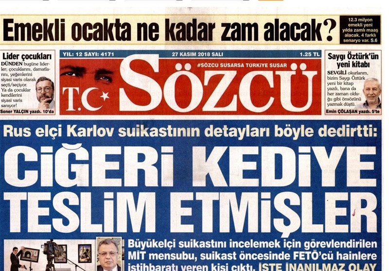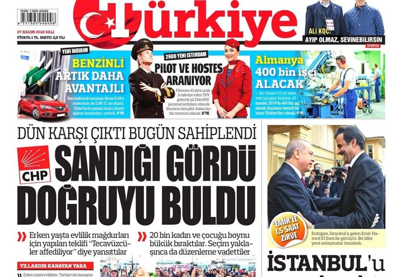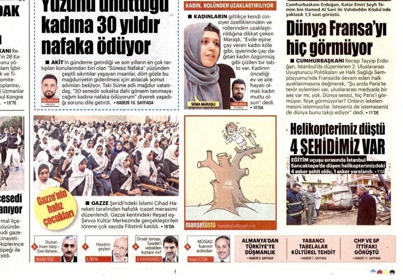 به گزارش گروه بینالملل خبرگزاری تسنیم ، بسیاری از روزنامههای ترکیه، امروز در عکس و تیتر صفحه نخست، کشته شدن 4 خلبان ترکیه در رویداد سقوط بالگرد را برجسته کردهاند. همچنین این روزنامهها موضوعات دیگری مانند دیدار اردوغان و امیر قطر را مورد توجه قرار دادند.