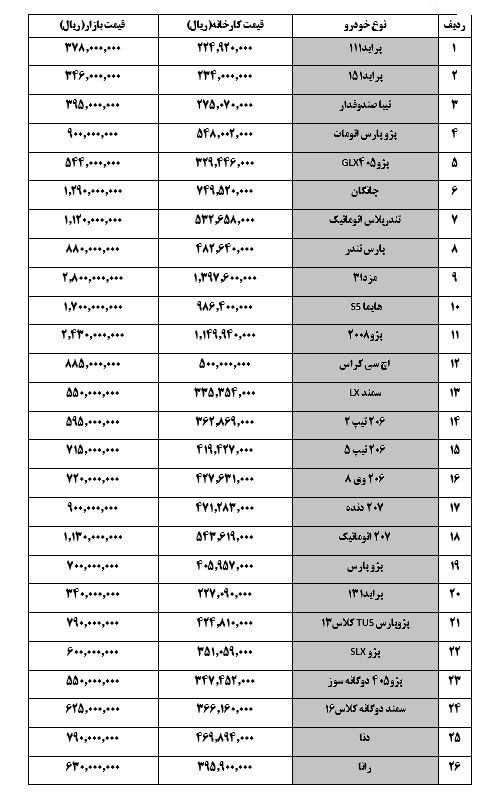 پژو206 صندوق‌دار با قیمت 72 میلیون تومان ، پراید 151 با قیمت 34 میلیون و 600 هزار تومان و پژوپارس  TU5 با قیمت 79میلیون تومان به فروش می‌رسد.