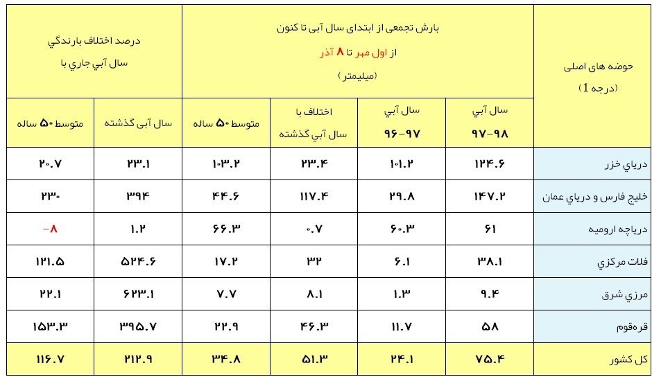 از سوی دیگر، در مقایسه میزان بارشهای سال آبی جاری با مدت مشابه به طور متوسط در درازمدت (آمار 50 ساله)، بیشترین میزان رشد بارشها را در جنوب کشور (حوضه آبریز خلیج فارس و دریای عمان) شاهد هستیم.