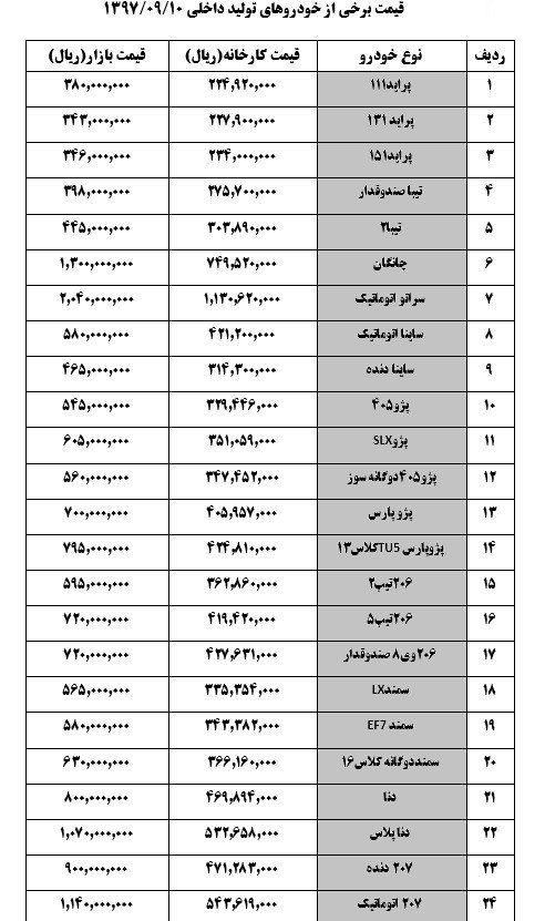 قیمت خودروهای داخلی در بازار امروز 1397/09/10 به شرح زیراست: