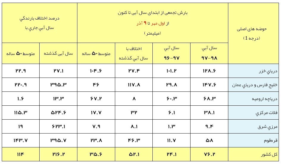 همان‌طور که در جدول بالا مشخص است، با ثبت 76.2 میلی‌متر بارش در 69 روز ابتدایی سال آبی جاری، نسبت به مدت مشابه به‌طور متوسط در درازمدت (آمار 50ساله) رشدی بیش از دوبرابر (114درصدی) و نسبت به مدت مشابه سال قبل رشدی بیش از سه‌برابری (216.2 درصد) را در میزان بارش‌های کشور شاهد هستیم.