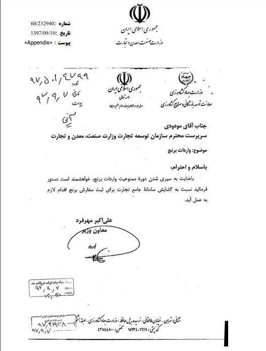 به گزارش خبرنگار اقتصادی خبرگزاری تسنیم ، علی اکبرمهر فرد معاون وزیر جهاد کشاورزی با ارسال نامه به محمدرضا مودودی سرپرست سازمان توسعه تجارت ، با توجه به اتمام دوره ممنوعیت واردات برنج، دستور بازگشایی سامانه جامع تجارت برای ثبت سفارش این کالا را ابلاغ کرد.