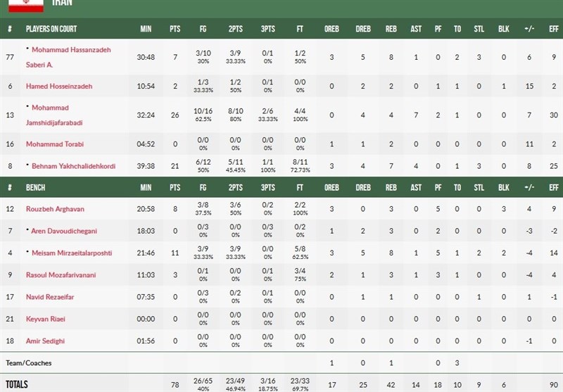در پایان این بازی، محمد جمشیدی با ثبت 26 امتیاز، 4 ریباند و 7 پاس گل،‌موثرترین بازیکن میدان بود. بهنام یخچالی هم 21 امتیاز و 7 ریباند دیگر برای ایران داشت.