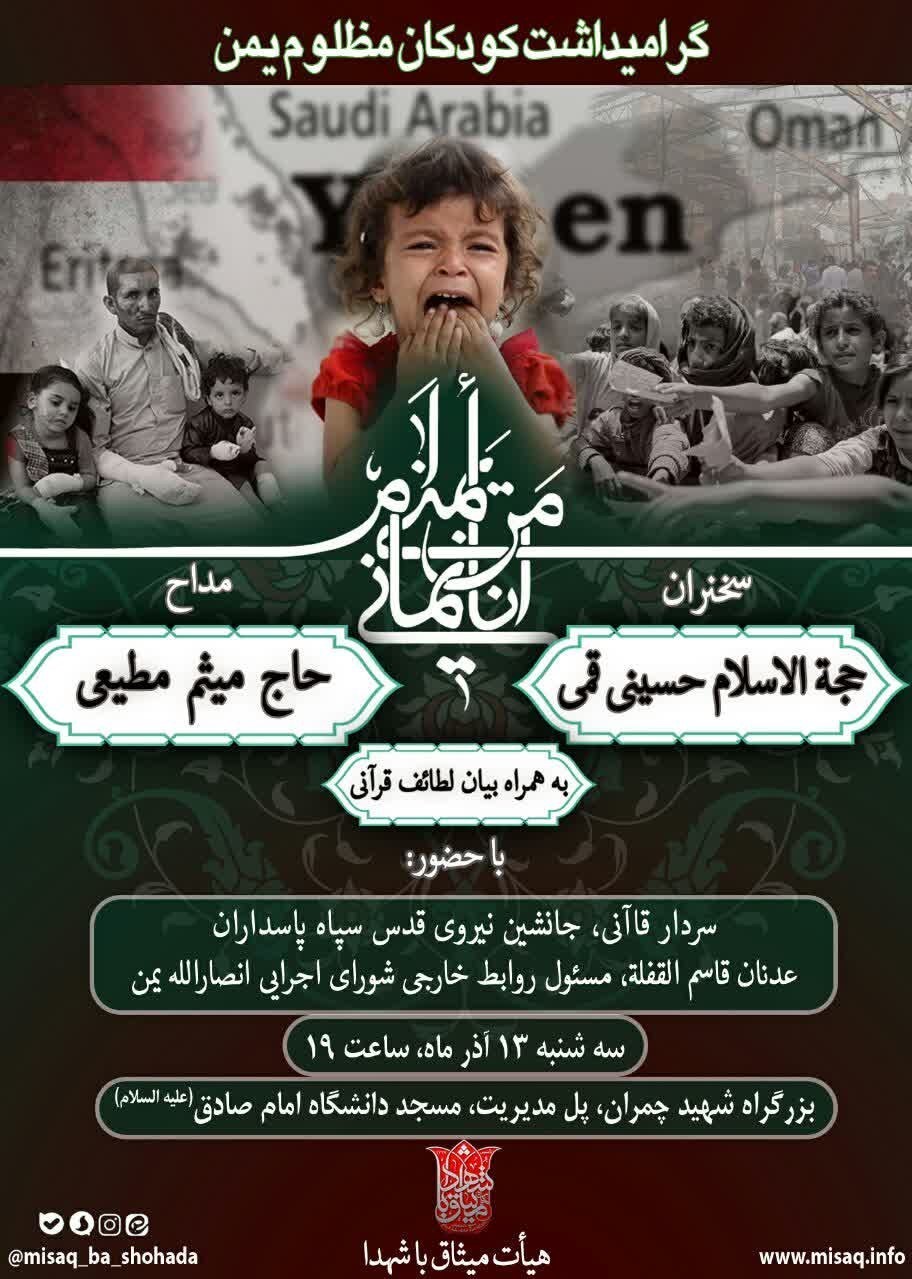 در همین راستا، هیئت میثاق با شهدا در ادامه ساسله جلسات خود امروز سهشنبه 13 آذرماه از ساعت 19 در مسجد دانشگاه امام صادق (ع) واقع در بزرگراه شهید چمران، پل مدیریت، برنامهای را جهت بزرگداشت کودکان مظلوم یمن برگزار میکند.