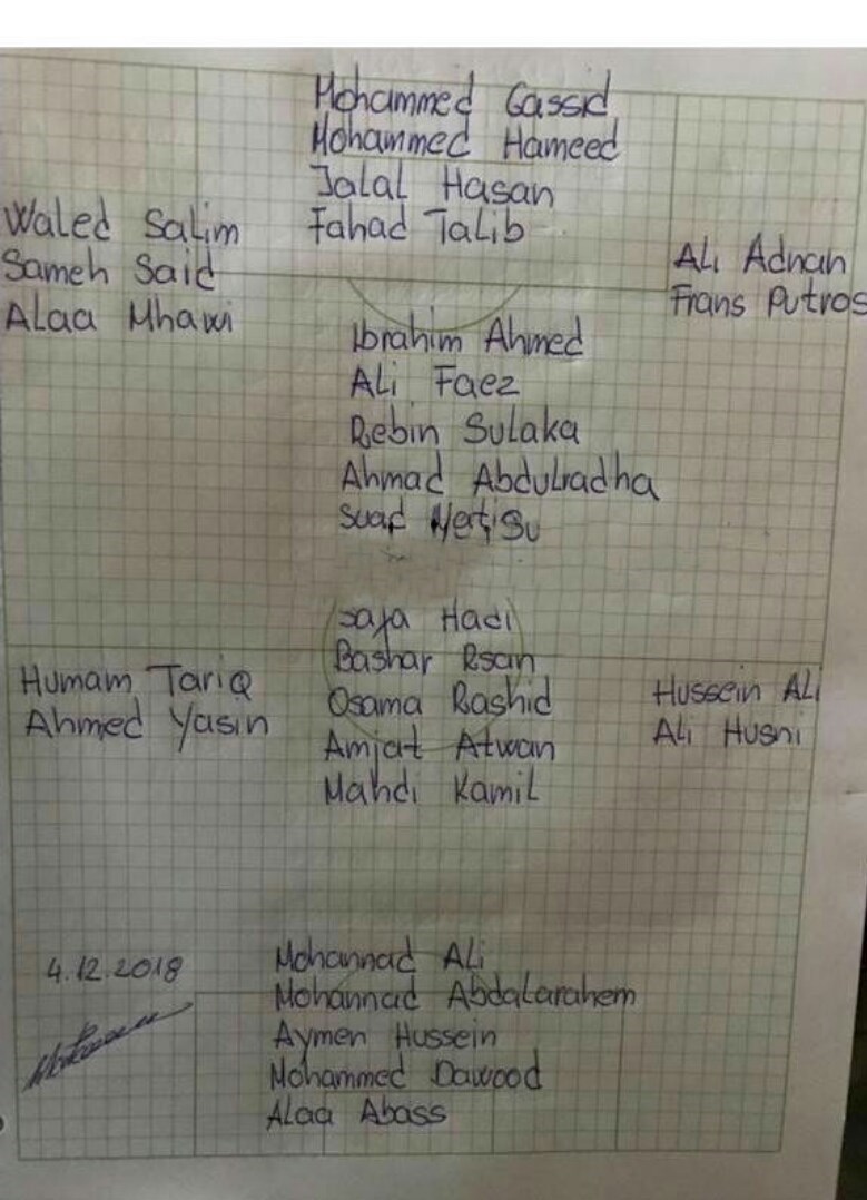 به گزارش خبرگزاری تسنیم ، سایت موازین نیوز عراق تصویری را منتشر کرد که در آن سرچکو کاتانتس، سرمربی اسلوونیایی تیم ملی فوتبال عراق اسامی بازیکنان را با دستخط خود برای اردوی آمادهسازی قطر نوشته است. در این فهرست دستنویس اسامی بشار رسن (پرسپولیس) و همام طارق (استقلال) نیز دیده میشود. روز گذشته مدیر اداری تیم ملی فوتبال عراق از انتشار اسامی بازیکنان این تیم برای اردوی قطر تا یک هفته آینده خبر داده بود.