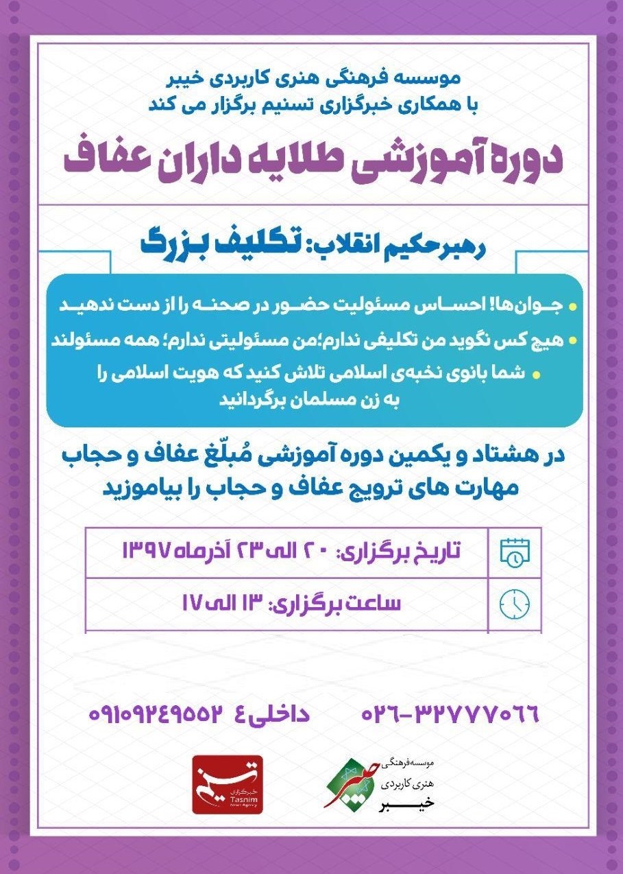 به گزارش خبرنگار فرهنگی باشگاه خبرنگاران پویا هشتاد و یکمین دوره آموزشی طلایه‌داران عفاف به همت مؤسسه فرهنگی هنری خیبر در خبرگزاری تسنیم برگزار می‌شود.