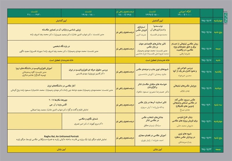 به گزارش خبرنگار فرهنگی باشگاه خبرنگاران پویا، جدول برنامههای هفتمین دوره از «همایش 10 روز با عکاسان ایران» در قالب نشستهای تخصصی، کارگاههای آموزشی، در جستجوی راهی نو و به سوی نگاه شخصی، منتشر شد.