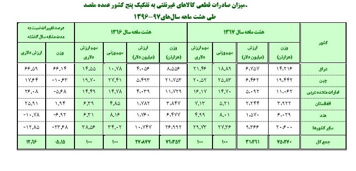بر این مبنا در 8ماه نخست سال جاری، حدود14 هزار تن کالا به ارزش تقریبی 6.7 میلیارد دلار به کشور عراق صادر شده است که نسبت به مدت مشابه سال قبل به لحاظ دلاری رشد 66 درصدی را تجربه کرده است.