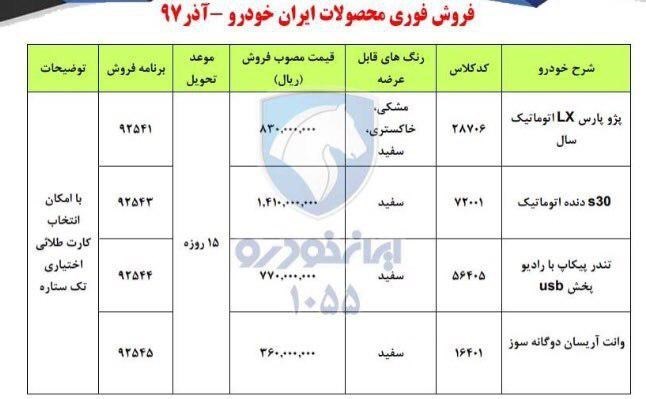 به گزارش خبرگزاری تسنیم ، محصولات تندر پیکاپ با قیمت 77 میلیون تومان، وانت آریسان با قیمت 36 میلیون تومان، اس 30صندوقدار اتومات با قیمت 141 میلیون تومان و پارس اتومات با قیمت 83 میلیون تومان در این طرح به فروش می رسند.