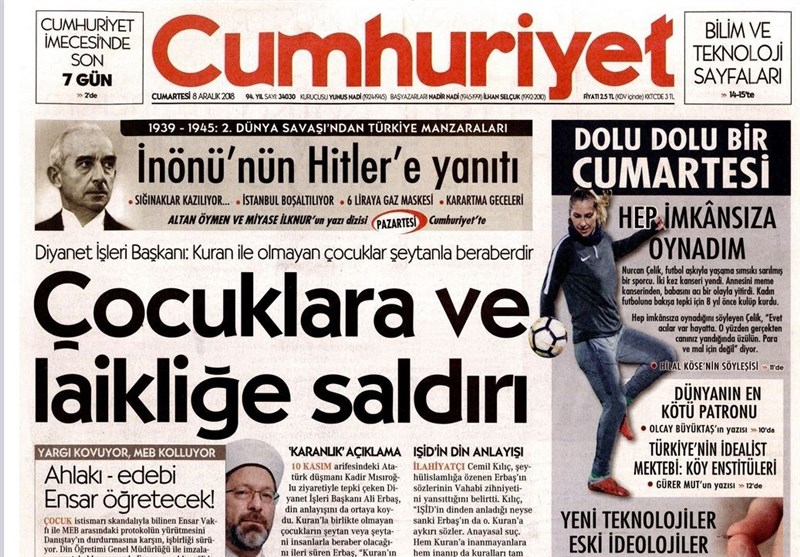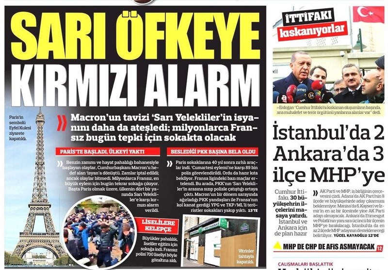 به گزارش گروه بین‌الملل خبرگزاری تسنیم ، بسیاری از روزنامه‌های ترکیه، امروز در عکس و تیتر صفحه نخست، اظهارات اردوغان در مورد ائتلاف جمهور را برجسته کرده‌اند. همچنین این روزنامه‌ها موضوعات دیگری مانند دیدار وزیر دفاع ترکیه با جیمز جفری و رویدادهای فرانسه را مورد توجه قرار دادند.