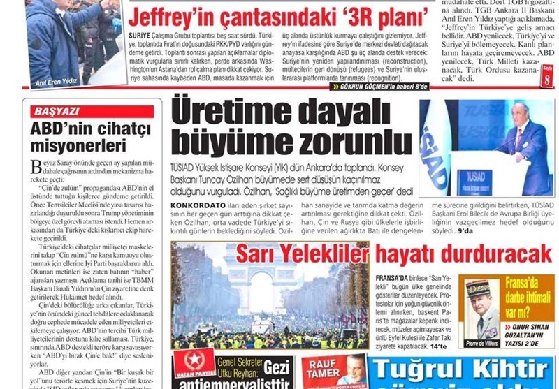 نشریات ترکیه در یک نگاه|نقشه شیطانی آمریکا٬ حمایت از پ.ک.ک در مرز سوریه/کشف رمز تلفن‌های ارتباطی شبکه گولن