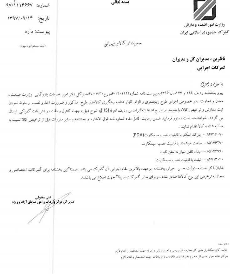 به گزارش خبرنگار اقتصادی باشگاه خبرنگاران تسنیم، بر اساس ابلاغیه گمرک، از این پس در گمرکات اجرایی قبل از ترخیص کالا نسبت به مطالبه شناسه کالا اقدام میشود. به این ترتیب برای واردات و ترخیص بارکد اسکنر با قابلیت نصب سیم کارت، ساعت هوشمند، مبدل تلفن سیار به ثابت و تبلت با قابلیت نصب سیم کارت باید شناسه کالا ارائه شود. گفتنی است، دریافت شناسه کالا در زمان ترخیص این اقلام، مربوط به اجرای طرح ریجستری و الزام اظهار شناسه رهگیری میباشد.