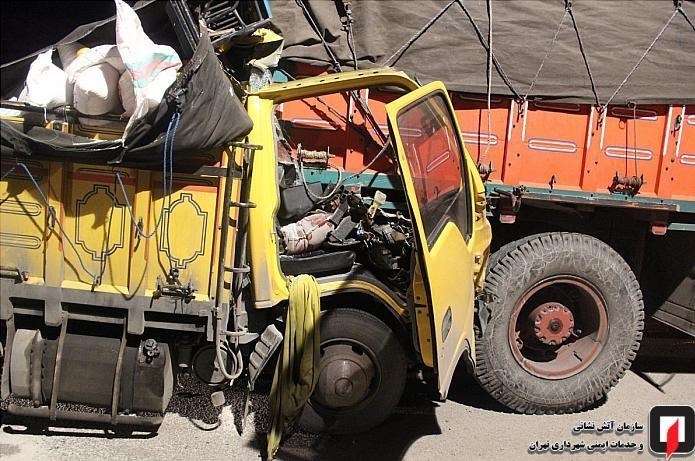 پیمان شامانی؛ افسر آماده منطقه سه عملیات سازمان آتشنشانی تهران درباره جزئیات این حادثه اظهار کرد: یک دستگاه کامیونت ایسوزو در حال حرکت به علت نامعلومی با قسمت عقب یک دستگاه کامیون تریلی برخورد کرد به طوریکه اتاقک جلوی کامیونت کاملاً از بین رفت.