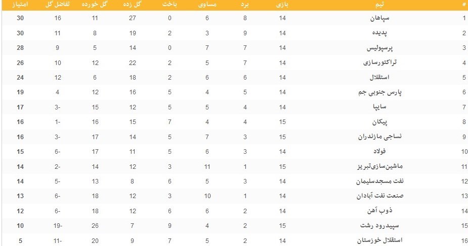 جدول ردهبندی لیگ برتر فوتبال پس از تساوی سپاهان و پرسپولیس: