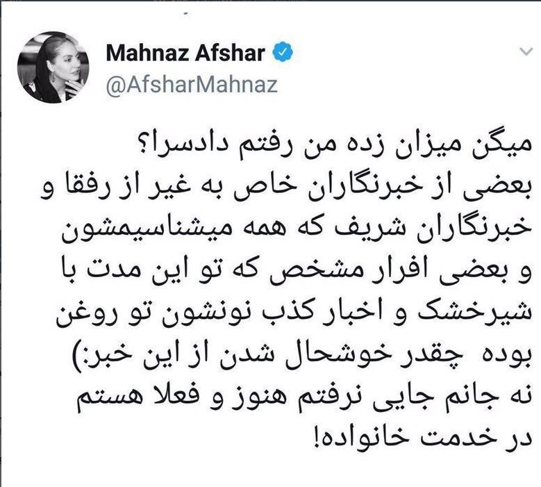 به گزارش خبرنگار قضایی خبرگزاری تسنیم ، در حالی که روز گذشته برخی رسانهها از احضار مهناز افشار به دادسرای فرهنگ و رسانه بهدلیل تبلیغ غیرقانونی یک آمپول برای معتادان خبر داده بودند، اما افشار با انتشار پستی در صفحه شخصی خود مدعی شد که به دادسرا نرفته و در خدمت خانواده است.