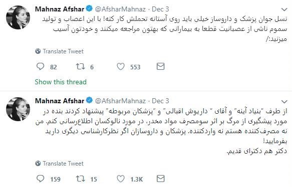 به گزارش تسنیم، مهناز افشار در روزهای گذشته اقدام به تبلیغ یک آمپول خاص بهنام نالوکسان برای معتادان و بهبهانه جلوگیری از مرگ ناشی از سوءمصرف موادمخدر کرده بود که با واکنش و انتقاد شدید پزشکان و مسئولان بهداشت کشور روبهرو شد؛ افشار اما در پاسخ به این انتقادات، بهجای عذرخواهی ضمن طعنهزدن به پزشکان برای بالابردن سعهصدر و ظرفیت خود، مدعی شد صرفاً دارویی را که یک بنیاد پزشکی و یک خواننده خارج از کشور تأیید کردهاند تبلیغ کرده و از تبعات مصرف آن بیخبر است!