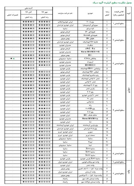 جزئیات کیفیت انواع خودروهای سواری را در جدول زیر مشاهده کنید.