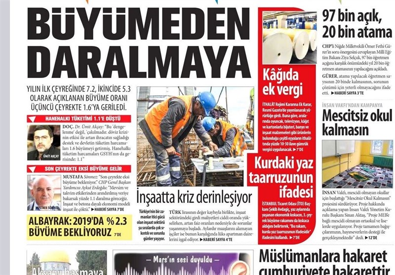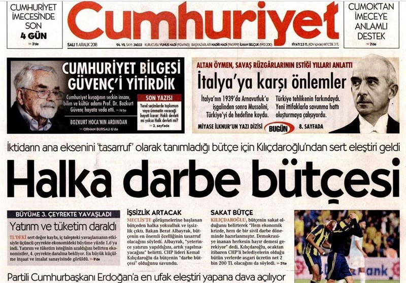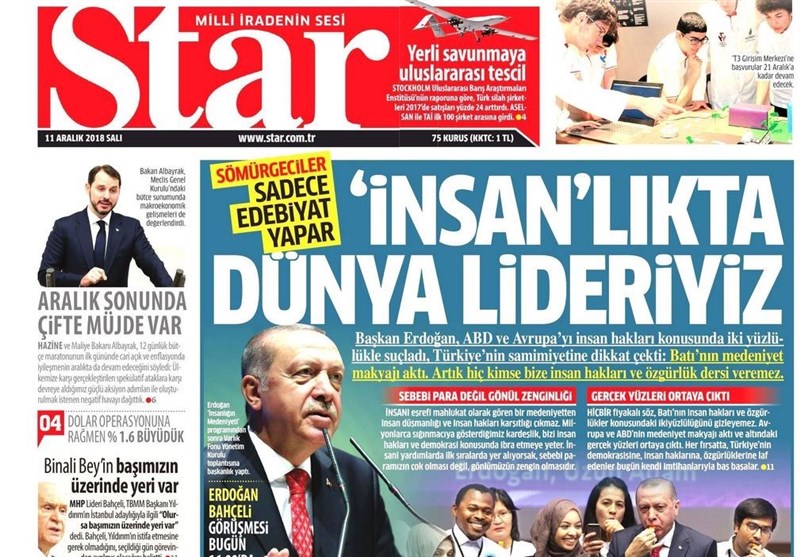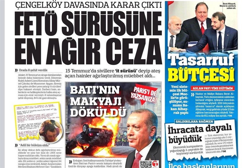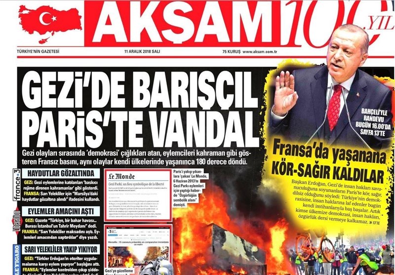 به گزارش گروه بینالملل خبرگزاری تسنیم ، بسیاری از روزنامههای ترکیه، امروز در عکس و تیتر صفحه نخست، سخنان اردوغان در مورد برخورد دوگانه جهان در مورد اعتراضات پاریس و استانبول را برجسته کردهاند. همچنین این روزنامهها موضوعات دیگری مانند بودجه 2019 ترکیه را مورد توجه قرار دادهاند.