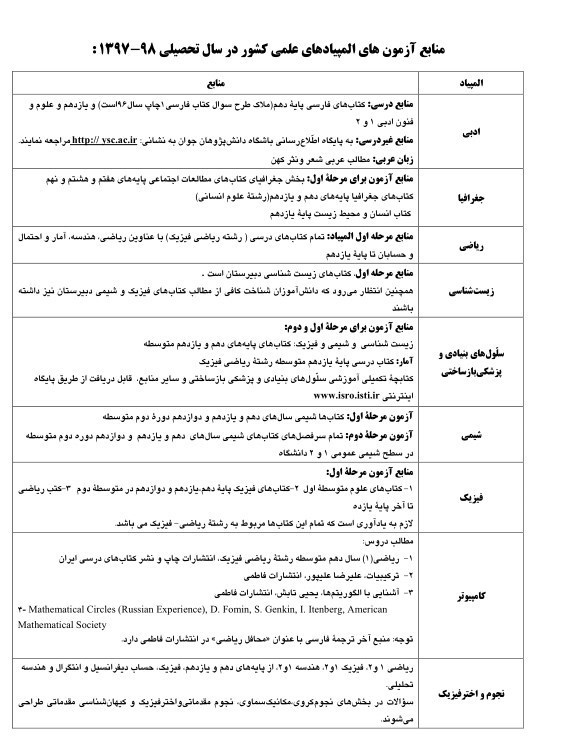 مرکز ملی استعدادهای درخشان و دانش پژوهان جوان منابع آزمون های المپیادهای علمی کشور در سال تحصیلی 98-1397 را اعلام کرد.