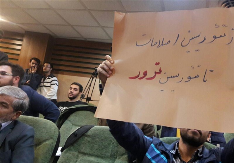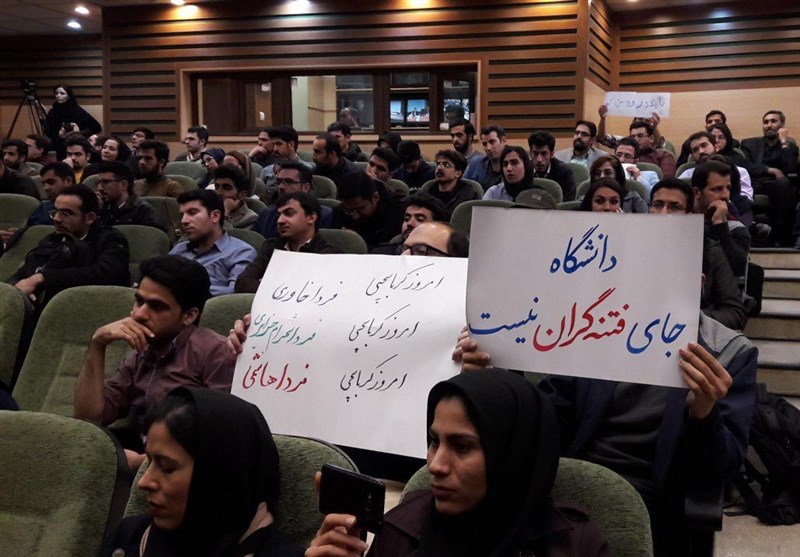 دانشجویان معترض در جریان این برنامه با در دست داشتن پلاکاردهایی با مضامین "دانشجو پیاده نظام فتنهگران نیست" ، "آنان که خواب آمریکا را میبینند خدا بیدارشان کند"، "دانشگاه مولود انقلاب جای ضد انقلاب نیست" و "امروز کرباسچی فردا خاوری" اعتراض خود را به حضور این افراد در دانشگاه خود نشان دادند.