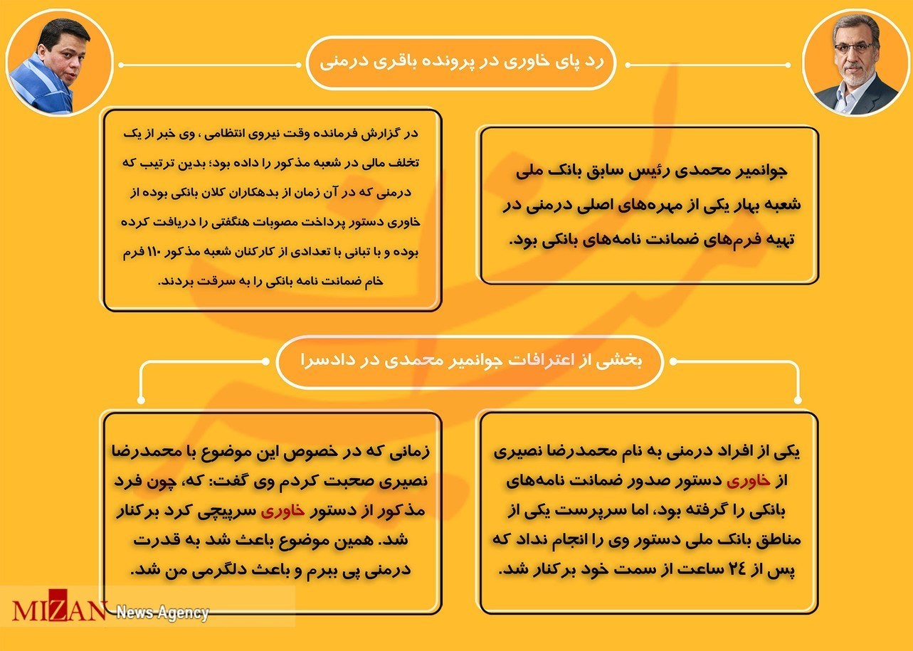 جوانمیر محمدی در بخشی از اعترافات خود در دادسرا اظهار داشت: یکی از افراد درمنی به نام محمدرضا نصیری از خاوری دستور صدور ضمانت نامههای بانکی را گرفته بود، اما سرپرست یکی از مناطق بانک ملی دستور وی را انجام نداد که پس از 24 ساعت از سمت خود برکنار شد.