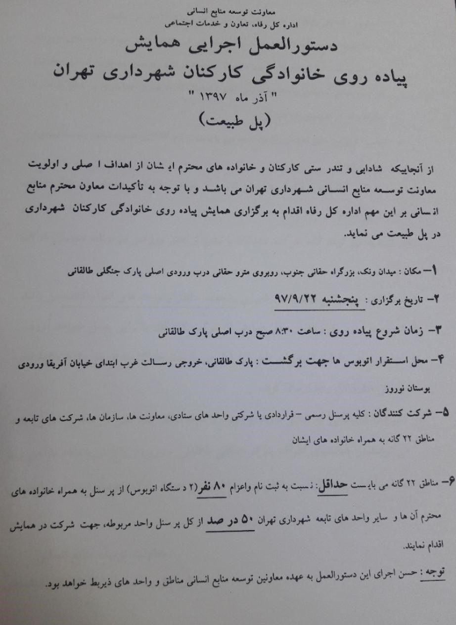 به گزارش خبرنگار اجتماعی خبرگزاری تسنیم ، پیادهروی خانوادگی کارکنان شهرداری تهران روز پنجشنبه 22 آذر ماه ساعت 8:30 روبروی درب اصلی پارک طالقانی برگزار خواهد شد و معاونت توسعه منابع انسانی اداره کل رفاه،تعاون و خدمات اجتماعی دستورالعملی را برای برگزاری این مراسم به اداره کل رفاه 22 منطقه شهرداری تهران ابلاغ کرده است.