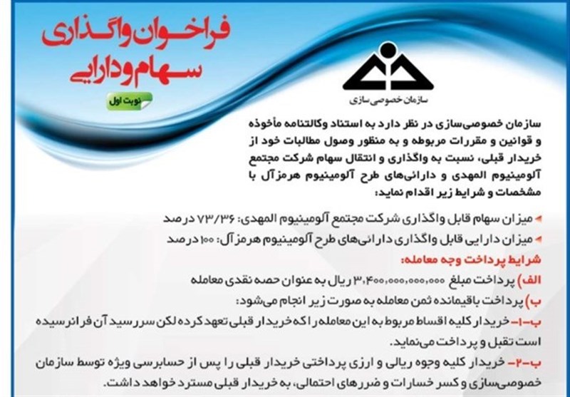بر این اساس به تازگی سازمان خصوصیسازی با انتشار فراخوانی اعلام کرده است به منظور وصول مطالبات خود از خریدار قبلی، نسبت به واگذاری و انتقال سهام شرکت مجتمع آلومینیوم المهدی و داراییهای طرح آلومینیوم هرمزال با مشخصات و شرایط مصوب اقدام میکند.