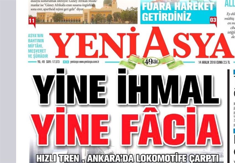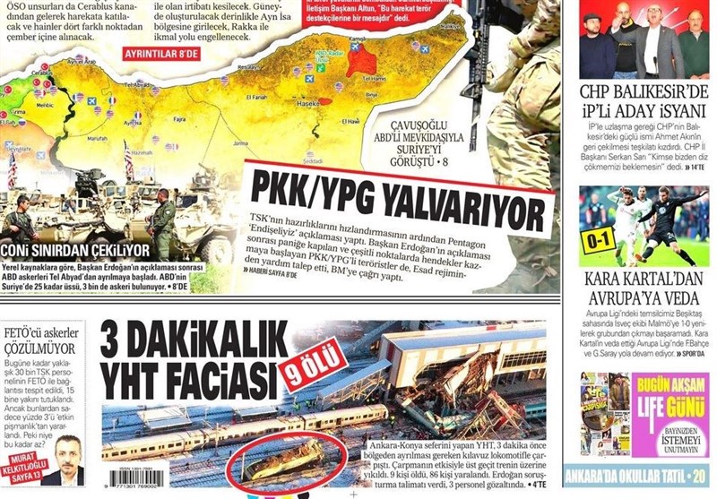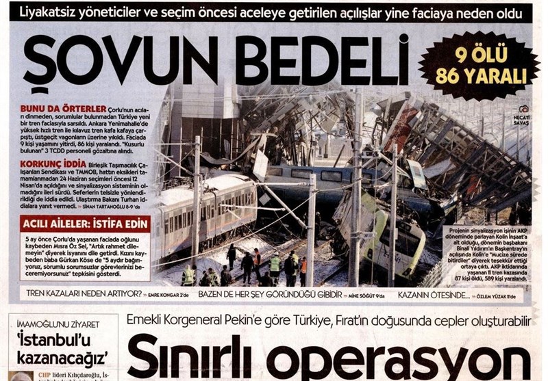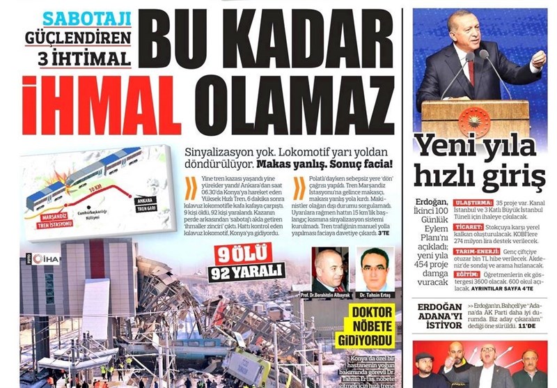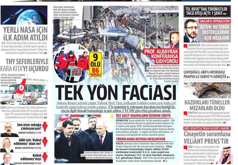 به گزارش گروه بینالملل خبرگزاری تسنیم ، بسیاری از روزنامههای ترکیه، امروز در عکس و تیتر صفحه نخست، فاجعه در قطار سریعالسیر آنکارا را برجسته کردهاند. همچنین این روزنامهها موضوعات دیگری مانند اعلام محتوای برنامه صد روزه دوم اردوغان را مورد توجه قرار دادند.
