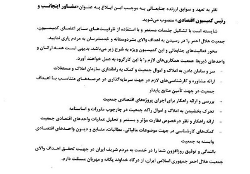 کمیسیون اقتصادی نیز که ریاست آن به ایشان محول شده، فاقد شأن اجرایی بوده و یک کمیسیون مشورتی است، چه اینکه در چارت اداری جمعیت هلالاحمر چنین کمیسیونی وجود ندارد و پیش از این نیز چنین کمیسیونی سابقه فعالیت نداشته است این کمیسیون برای نظارت و ارزیابی فعالیتهای اقتصادی راهاندازی شده است.