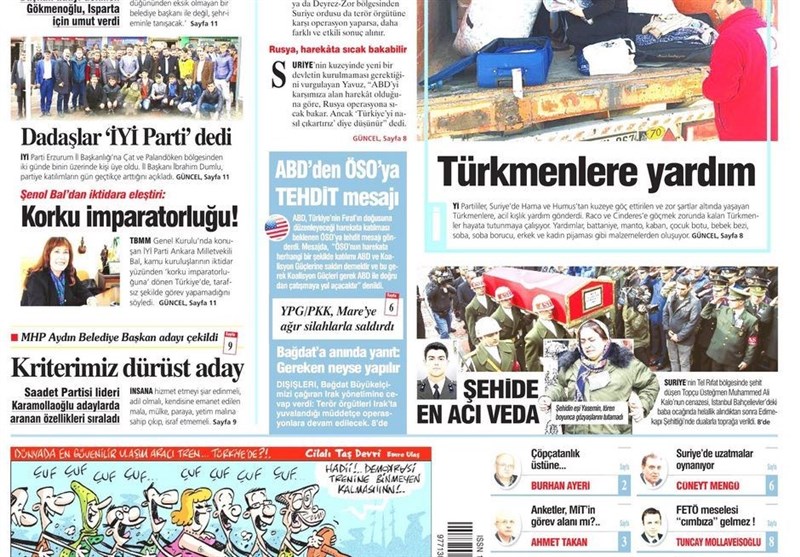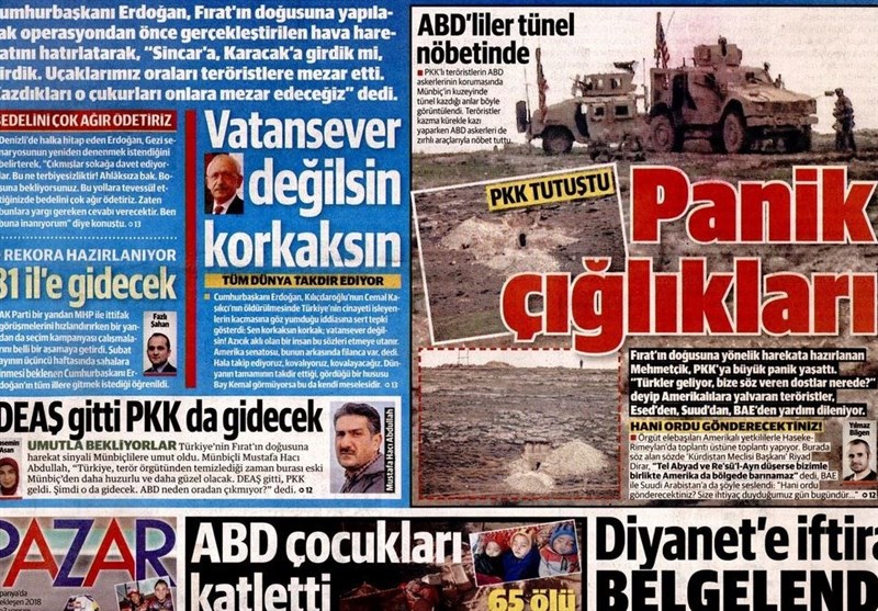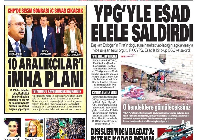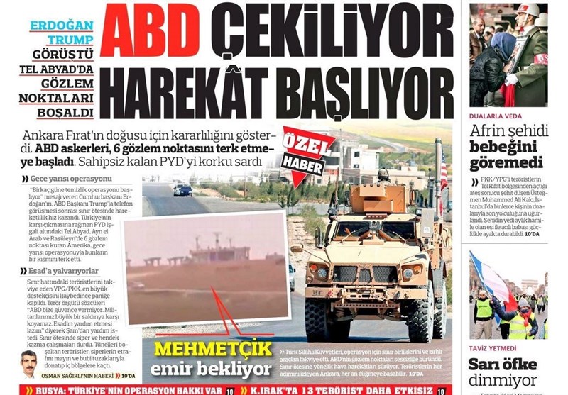به گزارش گروه بینالملل خبرگزاری تسنیم ، بسیاری از روزنامههای ترکیه، امروز در عکس و تیتر صفحه نخست، سخنان اردوغان در مورد حمله به شرق فرات را برجسته کردهاند. همچنین این روزنامهها موضوعات دیگری مانند تداوم اعتراضات در فرانسه را مورد توجه قرار دادند.